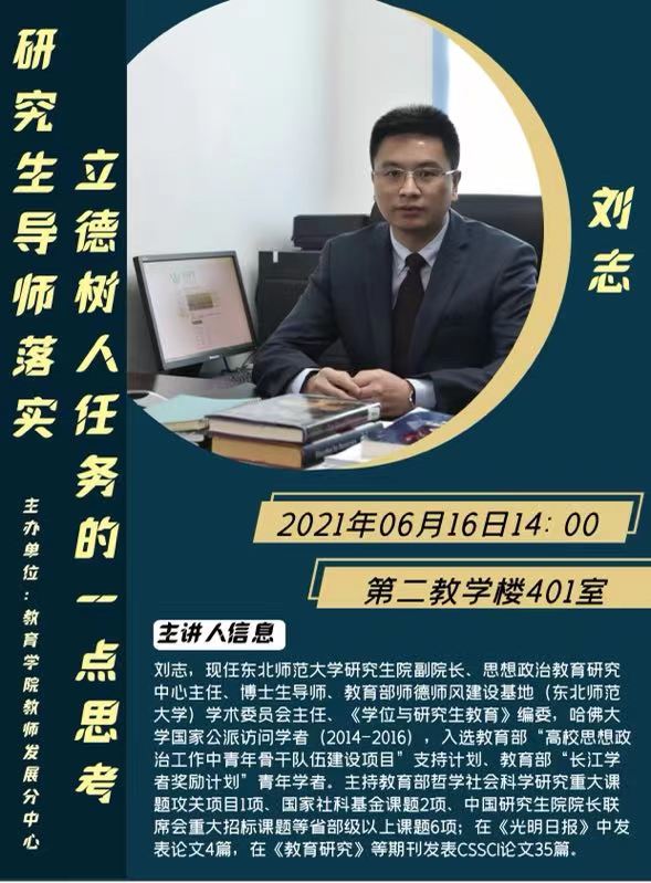 报告人简介:刘志,现任东北师范大学研究生院副经理、思想政治教育研究中心教授、博士生导师、教育部师德师风建设基地(东北师范大学)学术委员会主任、《学位与研究生教育》编委,哈佛大学国家公派访问学者(2014-2016),入选教育部“高校思想政治工作中青年骨干队伍建设项目”支持计划、教育部“长江学者奖励计划”青年学者。主持教育部哲学社会科学研究重大课题攻关项目1项、国家社科基金课题2项、中国研究生院经理联席会重大招标课题等省部级以上课题6项;在《光明日报》发表论文4篇,在《教育研究》等期刊发表CSSCI论文35篇。